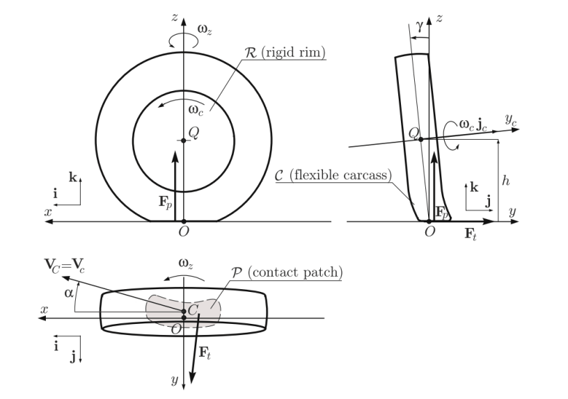The origin of tire coordinate frame (O) is sometimes the source of problems in the moment of tire modeling. Understanding that all vehicle wheels are cambered, it is difficult to identify or admit a center