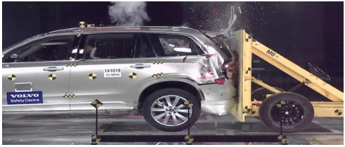 Another static test, but this do not need dummies. The rear crash test evaluate the degree of deformation of the car rear. This is a deformable zone made by special steel alloys and/or aluminum with the objective to absorb the energy impact. The vehicle is held standstill while a trolley is launched at 38 km/h toward the vehicle tail.