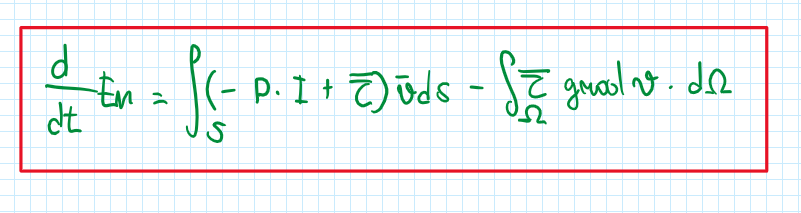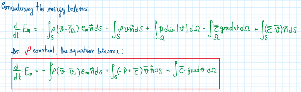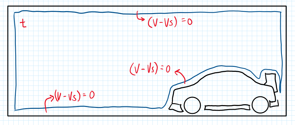 The term (V-VS) is zero everywhere, because the boundaries far from the vehicle the perturbation does not affect the flow. In addition, at the ground (V-VS) is also because there is no motion near to the surface. However, at the car surface there are velocities due to the non-slip conditions, thus (V-VS) will be also zero, because the velocity of the fluid equals to the one of the vehicle. Therefore the macroscopic energy balance can be upated: