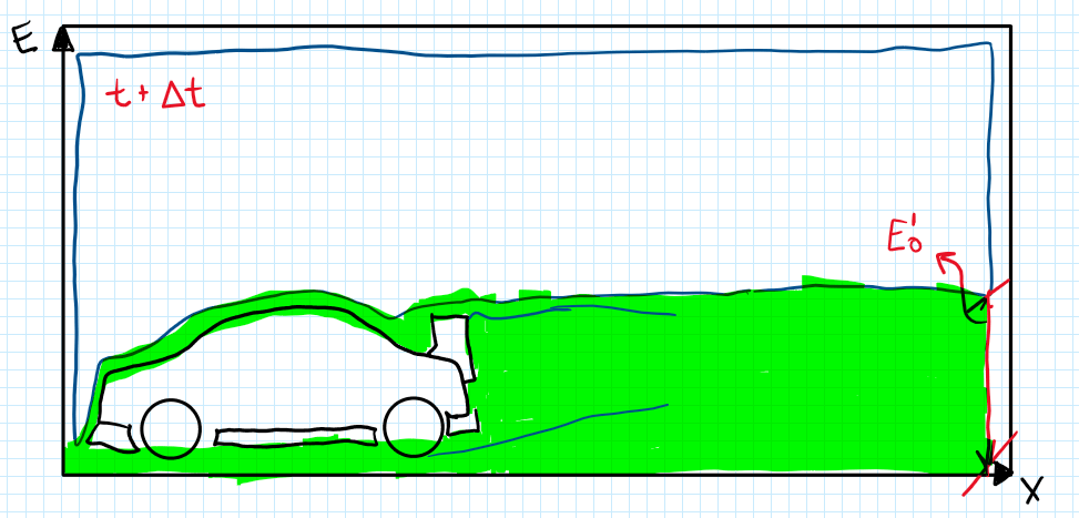 The effect of the passage of the car on these conditions is the constant wake formed behind it. The energy content is the area behind the curve, or the time differential of the energy Em. Comparing with the previous graph of the vehicle at the time moment t, the delta of Em will be the difference between the areas below the curves. In addition the magnitude of the energy content is the same for both cases, the difference is the integral (in red square):