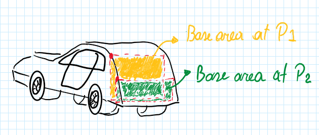 Therefore, the separation occuring at P2 provides a lower kinect at a zone of the rear of the car which has a lower base area, which is the main reason of the drag reduction. Assuming that the shape of the car is convenient to hold the streamline attached, the flow when separating at P2 exhibits a lower divergence and coherence.
