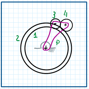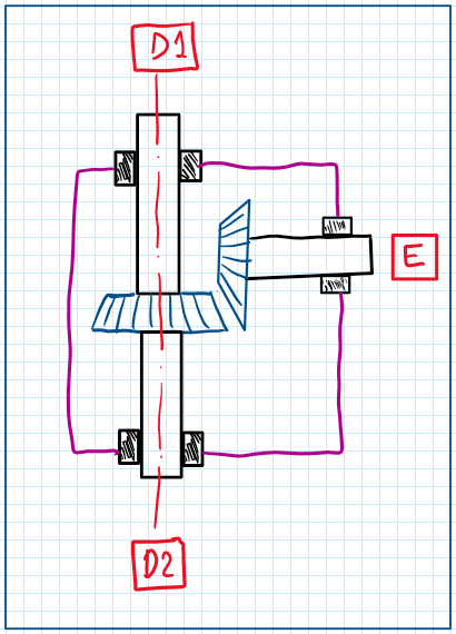 This is almost the same as the previous device, but with a higher efficiency during straight line traveling. As a characteristic of this transmission device, there are two output shafts, but it must be determined which of them are connected to the wheels. In this way the following equations must be developed :