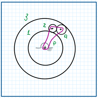 There are two shafts rotating at the same orientation and one at the opposite one . Thus the carrier shaft, which is given by P, is the input and this defines that the 1 and the 2 shafts are the outputs.