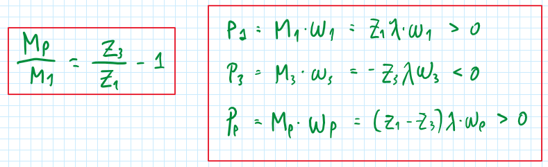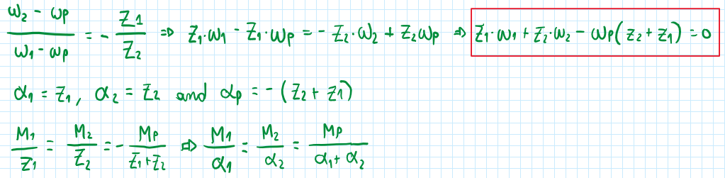 As can be seen the split torque equation means that Z1 is different from Z2 and this is a compulsory relation, because if equal it will operate as a differential. Therefore, it requires a different output speed, thus it can be written the following relations :
