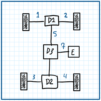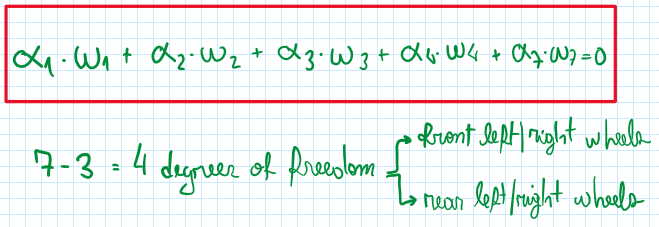 Therefore the architecture of a four wheel driveline is composed by 7 shafts and 3 differentials. Hence fixing each wheel rotation axles 1, 2, 3 and 4 it is possible to find the rotation of the engine as a function of these four. This is possible, because when the system is engaged the differentials reduces the degree of freedom of the axles from three to two, which is rotation of each wheel. If the system are all disengaged, thus 7 degrees of freedom are able. In both conditions the pure rolling condition are respected thus it is possible to write the following equation :