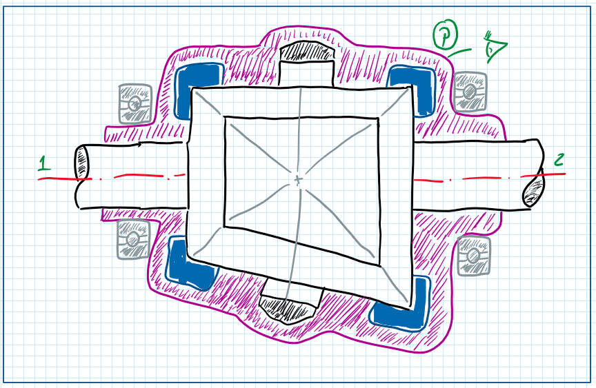 This is a critical point in the development of a four wheel drive drivetrain, because for the transmission device be able to split the torque, it must have an efficiency perfect at least at straight line travel. Hence considering central drivetrain the following equations and correlations can be developed. Assuming that the efficiency must be one, then R1 equals R2, because they have the same wheel size and Tau 1 equals Tau 2. with these assumptions, the system is able to provide F1 equals F2 and an efficiency equals to one. However understanding that even at low general direction there are considerable load transfer the F1 cannot be fixed equal F2, thus F1 is different that F2. Therefore differentials are not suitable for transmission of torque between axles. One of the solutions is the application of bevel gear split torque transmission.