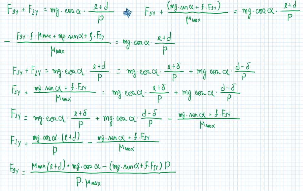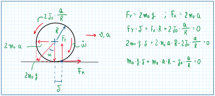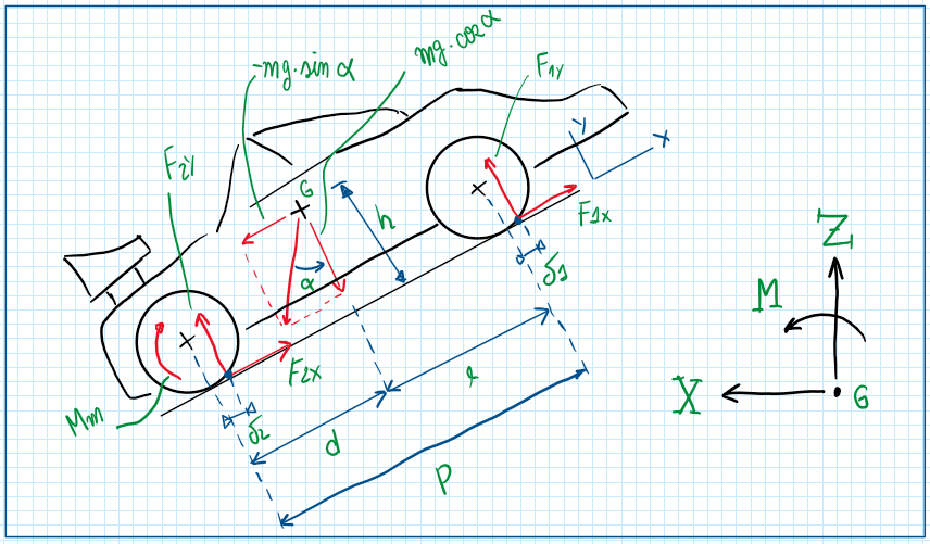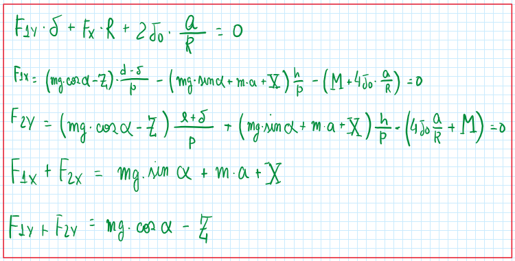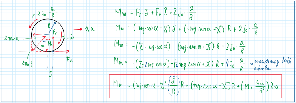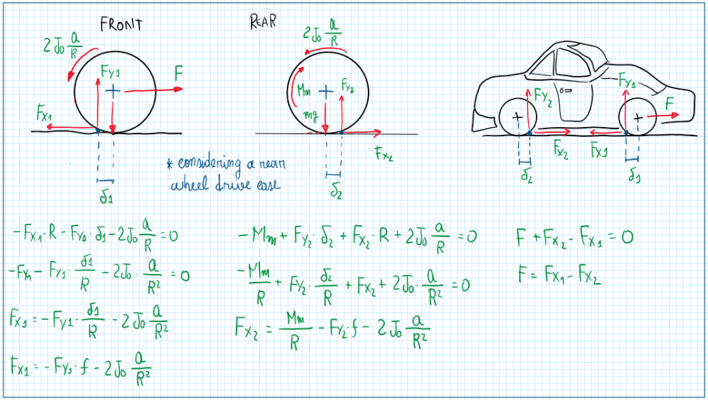 Taking advantage of the here tire contact points and using it as a reference it is possible to do the sum of all the equations. An important assumption is to consider the delta1 and delta2 (delta is rolling resistance coefficient) equal, this means that the tires are equals and their rolling resistance are also equals.