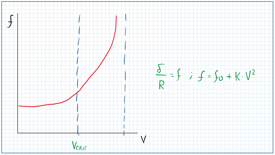 In general the parameter f has a value about 0.01 for asphalt or concrete surfaces . However this parameter is not constant and varies proportionally to the square of the velocity and the rate of increase is given by the coefficient K. Observing the graph, the increase occurs almost linearly until a point, which due to an error, the F increases abnormally. This point is given by the critical velocity, Vcrit. Therefore the tire operation can only be made under the speed limit (Vcrit), beyond this vibrations and waves propagates over the tire contact patch until a collapse.