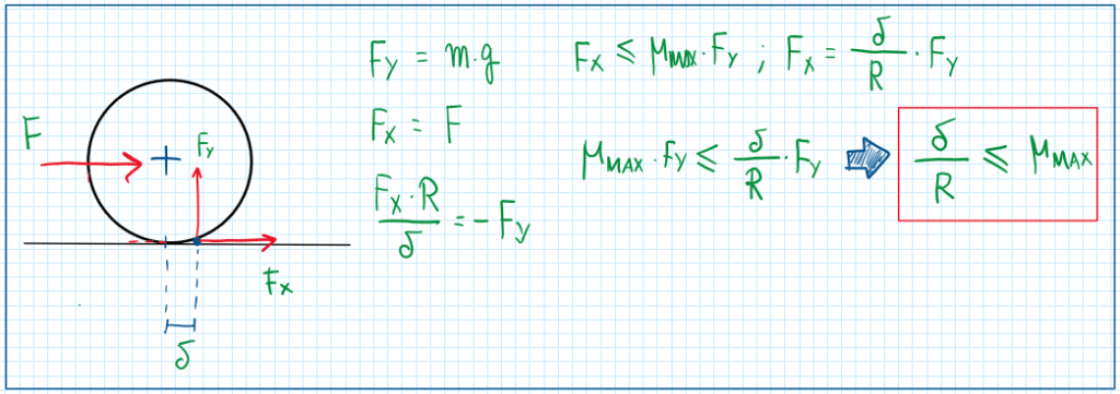 There are some considerations about the rolling coefficient and friction coefficient. In fact considering a wheel and establishing the following assumptions it is possible to write. As can be seen, the ratio between delta and R is less or equal to the maximum friction coefficient, which means that the rolling resistance coefficient cannot exceed the maximum friction coefficient. On the contrary, the wheel is unable to rotate. A situation which this usually happens are on off road conditions, more precisely on sand roads, which the values for the rolling resistance coefficient usually exceeds the maximum friction coefficient. Hence, the wheels slip over the surface without a pure rolling condition , in other words a rotation velocity different of the linear velocity of the wheel.