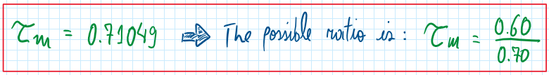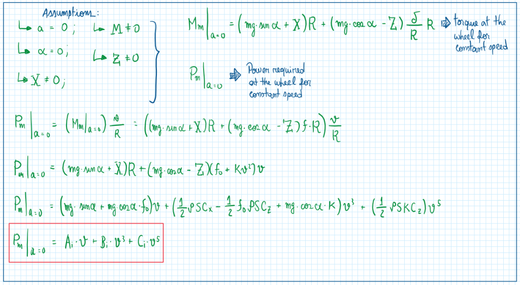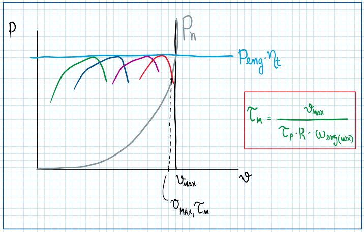 As can be observed, changing TauM it is possible to obtain several power curves, each of them touches the line of constant engine power. However, the curve respective to the power load is a parabolic one, because the rolling resistance and the aero loads increases with the cubic of the velocity. The point which those curves touch is the one which the power curve within a specific TauM must reach . Therefore for that maximum speed, it is required and specific gear ratio, which can be determined by the following equation.