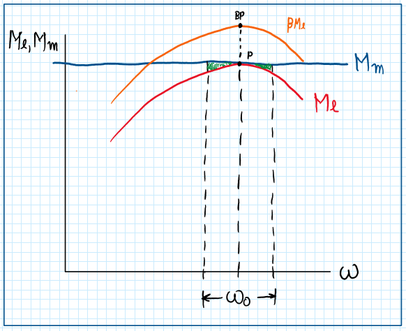 As can be seen on the graph the equation defined has a security factor beta. The reason for this is the rotation oscillations during engine operation. For that some assumptions are made, which means that there are some impulses on torque which results on oscillations of dw that increases on time. This represents oscillations about point P. However, if dw tends to zero, the oscillations are being reduced and w0 admits stable values. These oscillation region are inside the parabolic region.