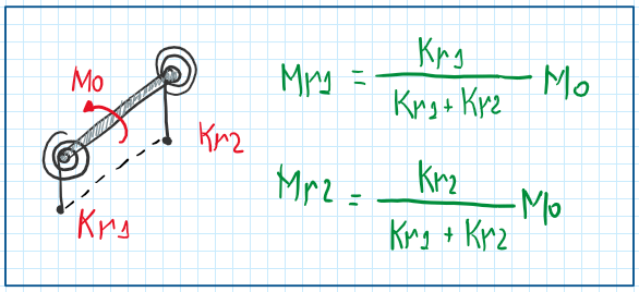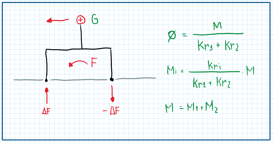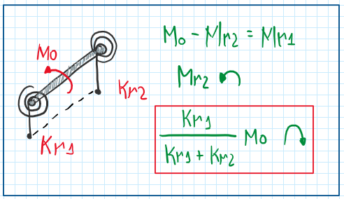 At this point, it possible to observe the effects on chassis due to the lateral load transfer motivated by the resistant torque. As a reaction, a moment M0 is generated on the chassis. Due to the assumptions that the chassis is reduced to a bar, the moment produced on each axle can be described by the formulas Mr1 and Mr2. Each of them is a reaction moment applied by the chassis on the axle. Hence, the Mr2 is a moment to the opposite direction of Mo and do not counter-balance it totally, because it is lower that. Therefore, to result in equilibrium condition: