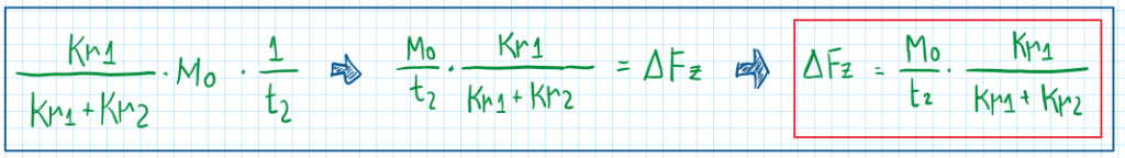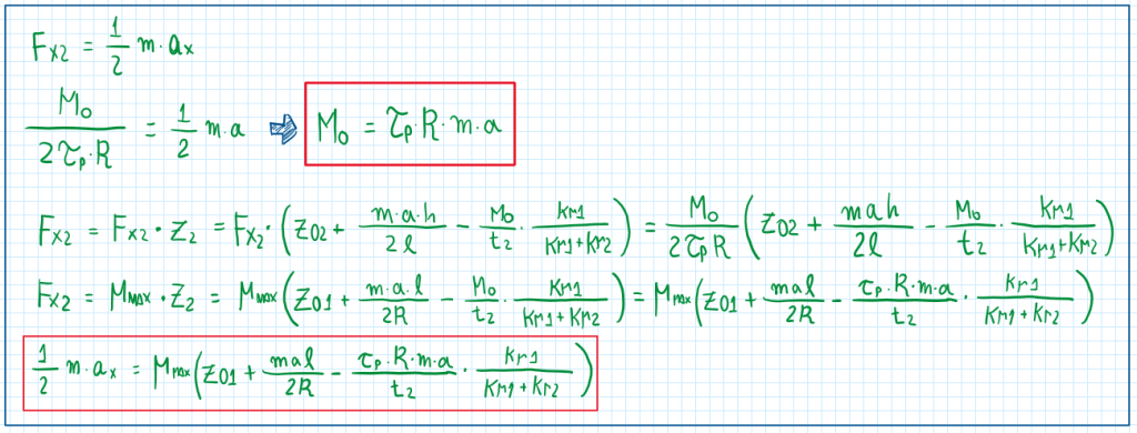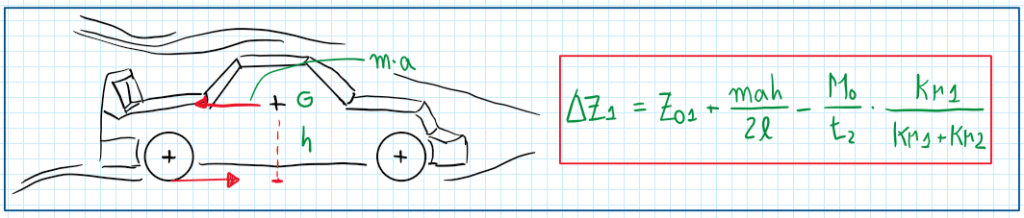 The last formula is the one of the additional moment applied by the chassis, through the suspensions, on the axles. In addition, this is the moment which results on the load transfer at the rear wheels. Hence, dividing the additional moment by the rear track t2: