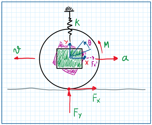 The automotive suspension must deal with three effects of the load transfer during vehicle operation, which are the lift, the dive and the squat. To avoid these suspensions are designed with mechanisms of anti-lift, anti-dive and anti-squat. The anti-dive is usually applied to the wheel hub, and has the following arrange. To analyze this situation it is considered a planar system which a wheel is under steady-state braking. Hence there is an acceleration a, which opposes to the velocity v direction. In addition, it assumed as reference, the center of the wheel hub. Hence it is possible to account the efforts due to the wheel hub translation and rotation (theta). As usual, the contact patch is exposed to two ground forces, Fx and Fy. However, in this analysis, Fy only accounts the longitudinal load transfer due to the braking. As the coordinate system is established at the center of the wheel hub, the Fx can be displaced from there. Hence a moment M must be added to compensate this change. To evaluate the compression suffered by the suspension during dive, the method of the virtual works is applied.
