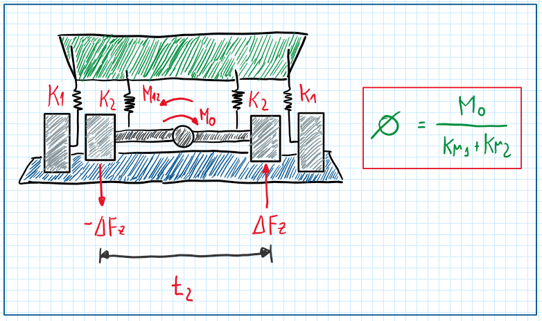 An usual situation for analysis is the lateral load transfer on rear wheel drive vehicles with live axle. This is also called resistant torque and its effects occurs under all vehicle operations. The differential transmits the torque provided by the transmission shaft to the wheels. As a reaction of the sprung mass a load transfer occurs. Hence it is possible calculate the roll angle due to this torque is the moment M0 is known. However, to better analysis it is useful to consider the torsional stiffness of the chassis as a rod supported by two torsional springs.
