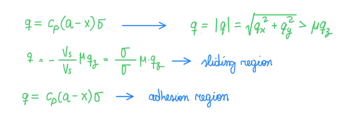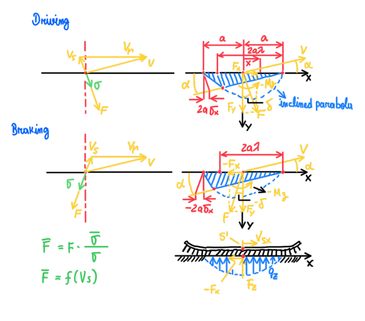 The combined slip is a situation which both lateral and longitudinal loads are occurring at the same time. In these cases the effect of σχ and α are even more important. The equations for this case were already described in Figures 12, 13 and 14, but when these are combined with the system of equations they are thus characterized by vectors and matrices which differs according to the tire contact patch situation, adhesion or sliding. In the first case it can be written: