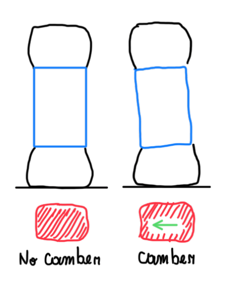 Figure 6 illutrates that there is a direct connection between the cornerning stiffness CS and tire contact patch area. It is possible to have two tires, a narrow and a wide one and these have the same contact patch area. In addition, these tires are submitted to the same slip angle and they have the same construction. Since cornering stiffness is given by the equation above, the main parameter relative to contact patch is its length, thus these tires will have different CS, which means that for the same α, they generate different grip. Hence, the wider tire has to perform a higher α to produce the same FY than the narrower tire. In fact, the difference between tire dimensions go beyond CS. Wider tires usually are more sensitive to camber variation than the narrow ones. However, narrow tires have more deformation of the contact patch to compensate the camber angle γ. In fact, the contact patch of a cambered tire is not squared, instead it is more trapezoidal. For this reason, cambered tires steer naturaly since there is always a lateral speed component (Figure 7).