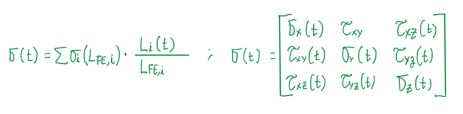 In the racing field data acquisition systems shows that in just 1 lap around a circuit, the chassis is submitted a very complex loadings. For fatigue analysis, loadings are not the parameter of interest, thus these are converted into stresses. Usually stresses are analyzed in terms of cycles. However, for so unpredictable loading case, the analysis is done in the time domain. Hence it is generated a stress-time series diagram. Since there are multiple loads acting, the time varying stress tensor σ(t) is generated: