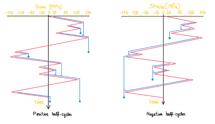 When the loading case is a very long time event, the best approach is the rainflow counting. Some literatures suggests to rotate clockwise the graph, others apply the method with the graph in its original position. In any case, the procedure is the same. First, count the positive half-cycles and then the second half-cycles. For the positive counting, the drop is stopped if it passes a more negative valley than it started. There cases which the drop stops when it encounters the run of existing drop. Figure 16 illustrates both cases. The negative one has the same approach. The main difference from the reservoir approach is that neither all cycles can be paired together. As can be seen, there are drops which are not paired. For these there are two options, or be considered as residual damage, or they can be closed together with the other drops to form a complete cycle.