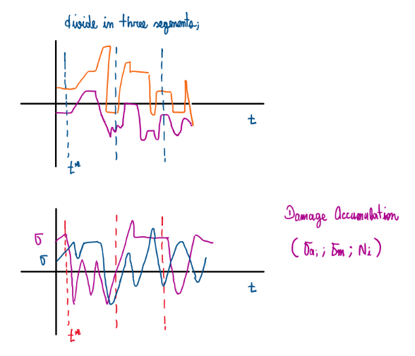 The load-time history is taken and divided in segments. Figure 22 indicates three common sections which can be evaluated. Inside each of them there are a sigma_a, sigma_m and ni for these cases. In addition it is also possible to compute Ni.
