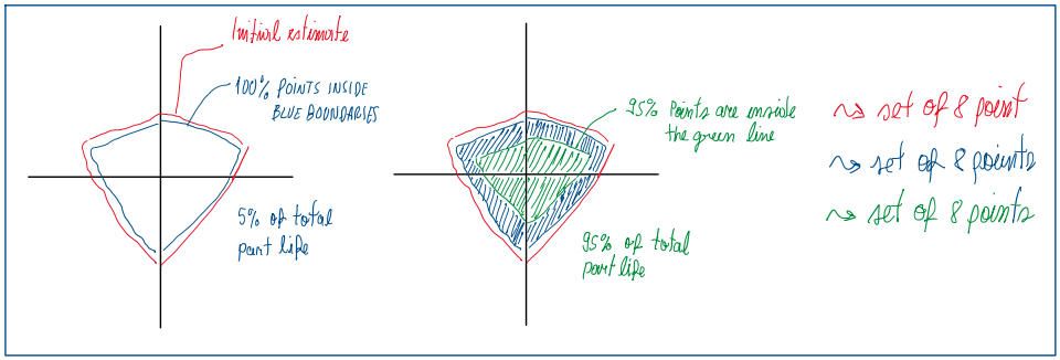 As seen in Figures 2 and 3, after defined the lines for the initial estimate (red one), 100% (blue one) and 95% (green one), the populations between P100 and P95 are transposed to the P100 boundary, these will be the representative of the 5% of the total part life. The populations from P95 until P0 are transposed to the P95 boundary. Hence this case represents the life cycle of 95% of the total part life submitted to the track loads. For instance, if the part considered should operate for 30,000 km, thus the amount of cycles will be 45,000. In addition, the P100 will represent only 1500 km or 2250 cycles while P95, 28500 km or 42750 cycles.