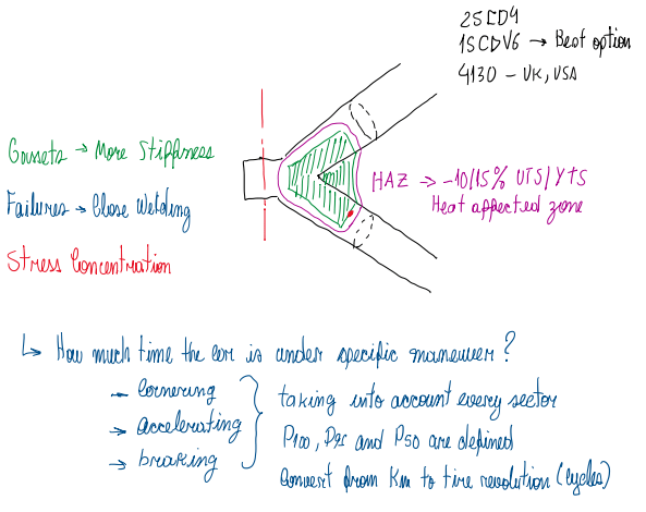 Considering two tubes that should be connected to form the wishbone suspension arm. The junction is made by welding of a part called gasset (Figure 10). This profile has the function of hold together the two tubes and improve the stiffness of the wishbone at that region. This is done because welding is a common source of failures. Since wishbones suffer some buckling and the regions at that point of the wishbone are exposed to high temperatures due to the brake system, thus they are heated affected zone (HAZ). Just an HAZ is capable to reduce UTS and YTS about 10/15%. The main materials used for the tubes are steel alloys 25CD4, 15CDV6 and 4130.