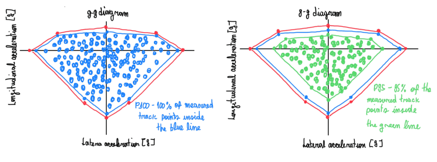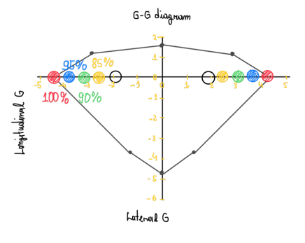 The g-g diagram is built using the information from the vehicle dynamics department and real data from acquisition systems, as Cosworth and Motec. The first is used to define an initial estimate of the vehicle performance, usually mentioned as what it should be. Hence the real data is plotted on the same diagram. The difference between “what it should be” and “ what really is” should not be big, because this means that the real car either is to heavy or too slow. After defined the g-g diagram, the plot of the real data is subdivided in 2 or 3 groups. These are the one of dots that should be inside the initial estimate boundary. The population are usually defined by the percentage of information used, thus P100, P95, P50 and P0, which means 100, 95, 50 and 0 percent of the track loads. It is important to mention that these one do not account the misuse loads. Although there are many dots on the diagram and each of them represents a vehicle maneuver, only nine of these are really important in the evaluation of the fatigue: