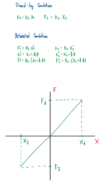 This first case is characterized by the fact that both springs are free, in other words, they are totally extended. Hence, the stand-by condition is characterized by the simple Hook’s law, F = kx.