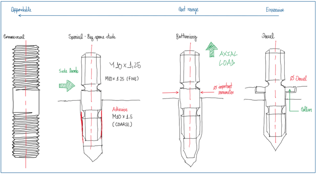 stud in the structure or component that works as support, as the finer tread is used to fix the main component. In case of monocoques, big spoke studs are used with the coarser tread in inserts. In addition, adhesives use to be applied to fix this kind of stud, since they are exposed to big torques and jet nuts for fastening. These nuts expose the stud to big friction loads during its unfastening which could undo the stud. The big spoke studs are good to deal with high side loads. Another kind of studs is the bottoming one (Figure 10). This is applied for cases which the axial loads are the highest ones. For this, an extended body is provided, which is the reason why it is called bottoming stud. This helps to distributes the load to all treads, because when it has fastened, the bottom part of the stud is compressed in the insert. The dowel studs (Figure 10) are characterized by a dowel in the mid section of it. Hence it requires a spot face to house the dowel/collar. The objective is to precise locate the stud. In fact, dowel studs are suggested to be used whenever is possible, but their cost is the highest one. From commercial to dowel studs the cost can vary to 0.3 to 8 £.
