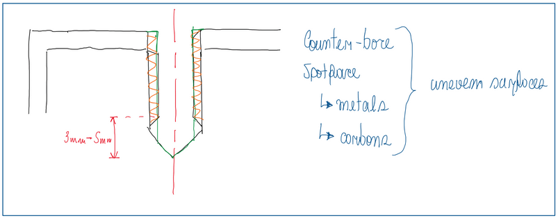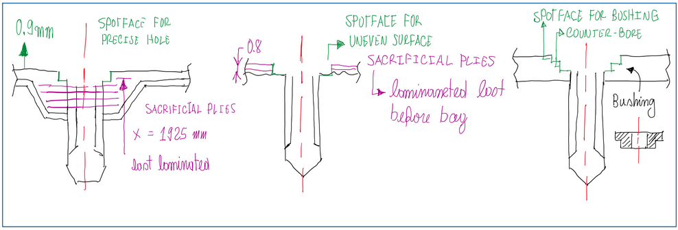 The main problem to machine on carbon is that it remove plies which can weak the structure in that point. To avoid this it is added some extra layers of plies whose are called sacrificial plies. In general the spot face is differently applied. For instance, there are cases which the hole must be precise and the surface should have a good finishing. Hence, sacrificial plies are laminated between the structural ones. The main concern of this approach is if the hole cracks, thus the stress will be transmitted to the structure. For this reason the sacrificial plies are placed around the hole and between the structural plies. When the surface is uneven and there is no requirements for a rigid tolerance, the sacrificial plies are laminated over the structural one to preserve them. Another kind of bore is the spot face and the counter-bore together. The objective of this second feature is to provide a precise location for the bore, thus a precise bushing is fitted in the counter-bore. In this way the advantage of the spot face and counter-bore are combined to provide a strong and precise bore. It is usually used for fastening of engines or components that requests a rigid tolerance for their position.