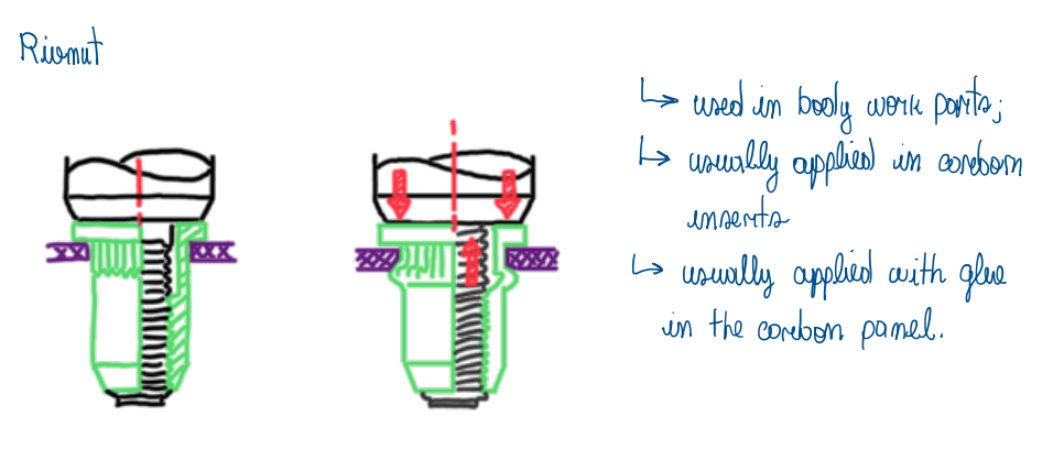 For these cases another kind of rivet is applied, the Rivnut (Figure 2). This is composed by a bushing which features a nerve at its top region. Inside the bushing there is a tread for the shaft, similar to a bolt, but without the head. The bushing is properly designed to be mounted on inserts and to provide a great contact area for the glue. The main application is for carbon fiber bodyworks. In fact, rivets are not good to be used in structural junctions.