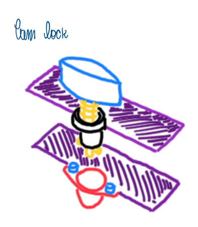 The cam lock mechanism (Figure 8) is similar to the livelock, but more simple and heavy. It is based in a pin inside the insert and a spring between them. This is always pushing the pin out of the insert. At the bottom of the pin there are cams which lock in the slots at the bottom of the insert, thus locking the panels. The way which the panels should open defines how the cam lock is considered open or closed. This technique is usually adopted in racing series which the budget is more restricted.