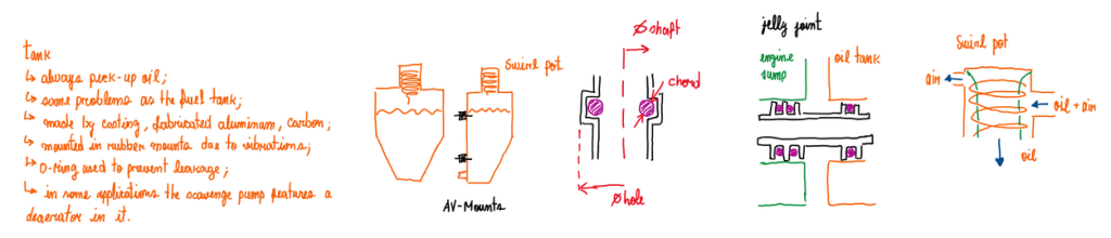 The system enters in operation together with the engine, a scavenge pump drain the oil from the engine sump and sends it to an oil tank. This has not only a function of a reservoir, but also to separate the air from the oil. Although the lubricating system operates without air, it is atural that there is some air in the system, because there are some points of air entrance on it. Hence a decanter is applied at the top of the oil tank. This is called swirl pot and it is usually at the top of the oil tank. The oil pump absorbs the oil from the tank and send it to the engine at high pressure. Different from road cars (without dry sump system) the oil pressure reaches values above 6 BAR. Finally the scavenge pump absorbs the oil from the sump and send it to the tank, thus the cycle restarts.
