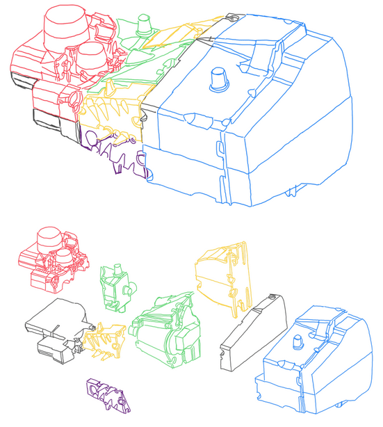 The main problem of this process is to create the inner volume of the gearbox casing. For this, parts called cores are used to, not only define the inner volume, but also the wall thickness. In fact, cores define where there is metal, where there is not. Due to the complexity of a race car gearbox casing geometry, the core is split in several parts called boxes (Figure 13).