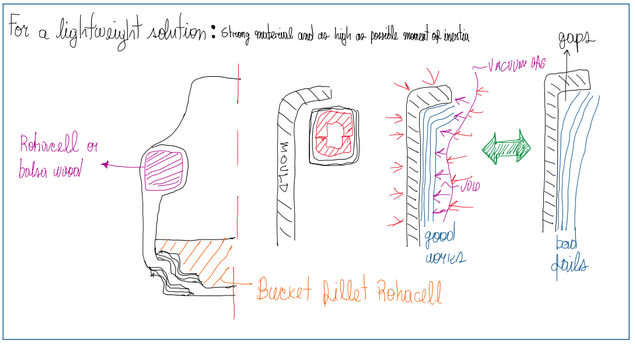 Although a new material usually add weight and a bigger cross-section area means more material, a hollow one is a great solution to reduce weight. Hence, a section of Rohacell was first substituted by a smaller one, and then, a complete hollow section. The manufacturing process to obtain this shape is complex.