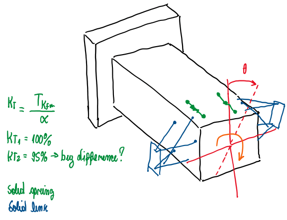 The total torsional stiffness can be calculated according to Figure 8, which describes the chassis a parallel spring combination. An approach to evaluate the monocoque, is fixing this one a rig which performs its torsion. In addition, using solid links in the place of coilsprings and suspension arms will isolate the monocoque which makes the experiment more precise (Figure 9).
