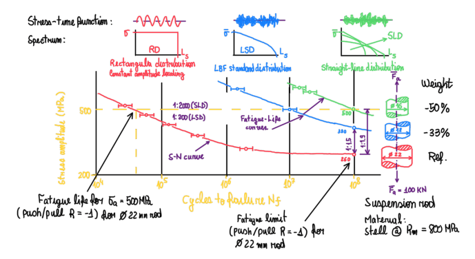 Figure 11 there three kinds of suspension rods being evaluated, they have 22 mm, 18 mm and 16 mm diameter and are exposed topush/pull test of 100 kN. The first situation, 22 mm diameter rod, results in a fatigue limit of 260 Mpa at E8 cycles. This is a long-life component for sure. However, if it is considered that this rod is exposed to 500 Mpa stress which is a result of a rectangular distribution RD. As can be seen, this loading configuration results in a progressive reduction of the fatigue limit of the rod. However, if another test is done with 18 mm rod using other distribution, it is possible to have a fatigue limit of 500 Mpa, but at higher number of cycles. In fact, what Figure 11 illustrates is that the kind of loading has a great influence on how high can be the fatigue limit. The LBF standard distribution is a kind of loading developed in Germany by LBF institution. Finally, the last case is the 16 mm rod which is exposed to the loading distribution SLD, straight line distribution. It reaches 500 Mpa at highest number of cycles of all cases. Therefore, Figure 11 suggests that with the proper information and evaluating carefully its spectrum, it is possible to choose the loading distribution that best fits situation, or to build a loading distribution that emulates the real conditions. Driving simulators can help a lot in these cases together with track test data. Hence, with correct spectrum and load distribution for the loading condition, it is possible approximate to a lightweight construction with a controlled loss of durability.