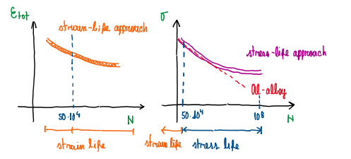 This method assumes that the material is always at the elastic behavior. In this case, the fatigue estimation is exhibited by the so called S-N curve. Hence, the key parameter is the stress. It usually ranges from 50E+4 cycles to above.