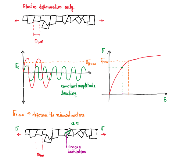 As can be noticed, a constant amplitude loading is a conservative approach to estimate stress and fatigue life. Once the material stress-strain curve is known, it is possible to evaluate how near or far from the yield stress the component are. Although a precise loading must be defined, this information can help the engineer to understand how tolerant the part is against a misuse. Hence, misuse loads are frequently introduced at the fatigue tests. At the microstructure point of view, the stress applied on a component deforms the crystal lattice of the material. In this way, at the stress level there are planes which this deformation changes them in the load and stress direction, in other words, it strains. However, at same time a portion of this deformation remains on the elastic condition. Hence, when the load is reduced, the deformation is completely reajoint. This is associated to the well known fatigue limit or very long life. However, this occurs only when the component is kept under elastic condition. When the load reaches a stress characterizing the material yielding, the microstructure suffer a plastic deformation. This distort the microstructure, so it changes its shape. The grain distorts by a mechanism called slip, which is a kind of plastic deformation. After returned to the no stress condition, this microstructure holds the distortion, but some portion are still in the elastic condition. The result is a crack initiation. For this reason, it is important to evaluate under the strain life method, because it is possible to estimate how tolerant the material is against misuse loads. The fatigue mechanism is a cumulative penalty, even the loads which are under the elastic deformation level may cause some microstructure portions to suffer a plastic deformation. Inside this some grains are displaced in a favorable direction, thus microcracks arise. These evolve during the cycles and became macrocracks. This is called crack initiation. Due to the unpredictability of grains orientation and elastic-plastic condition, the crack initiation is a statistical phenomena. The fatigue often occurs at the surface of the components, because the most mechanical cases have the most critical point at the surface due to several reasons. Some of these are that the stresses are higher at the surface (Bending, shear and torsion), the variation of the cross-section and the effects of the environment. Hence the plane of the crystalline structure and its grains slip during loadings. The slip goes through grains which became plastically distorted. However these performs monolithic plastic deformation which can not be observed with visual analysis. As the load continues, more and more slips are occurring and new grains became plastically deformed. The ones which already were plastically deformed are more stressed. Some of them are in the limit of material yielding, and then crack. The component does not exhibit any operational effect and the fracture occurs without advice.