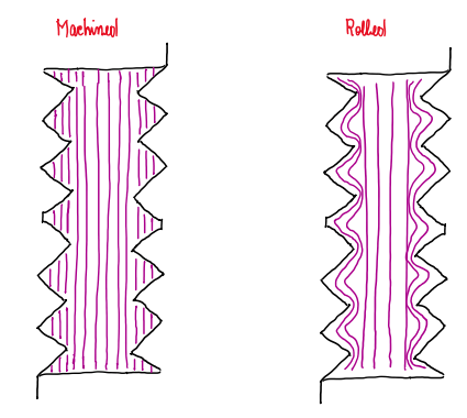 Usually bolts are made by machining or rolling (Figure 8). Basically, in the first case the material is cut and there is no or small amount of residual stresses. The other option is rolling. An ingot is forced against a screwed hole and get out of it threaded. This process implies a plastic deformation of the material surface, thus a residual stress made due to the compressive loads which plastically shape the thread. The result is a more strong threaded shank. Since there are several option and manners to improve the residual stresses, the same can not be said by the estimation of how much residual stresses was applied to the material. In fact, it is difficult, because this effect occurs due to the microstructure modification. The method used is the x-ray refraction. The lattice deformation can be detected and evaluated by the ifference between the angle which the ray reaches the structure and its angle after refraction (Figure 7). This occurs because the distance between fibers change or reduces when a plastic deformation is imposed to the material. In this way, it is possible to estimate the amount of residual stress. This is important for parts and components which operates with a pre-load.