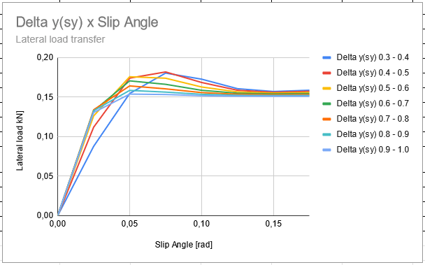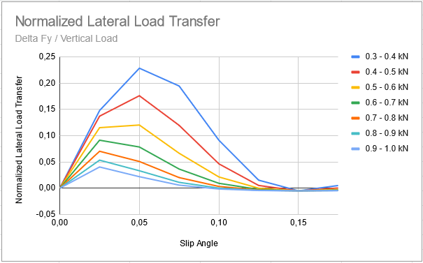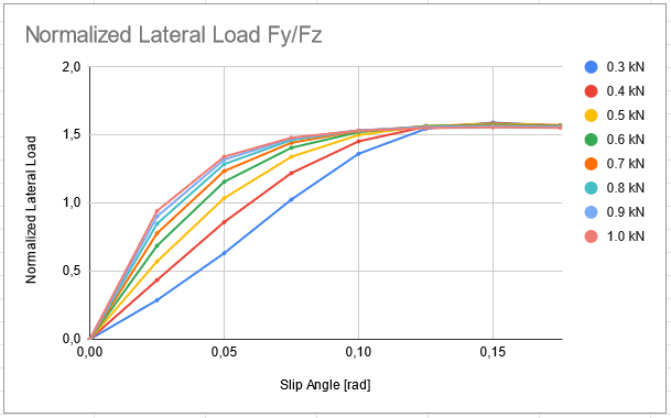 Figure 11 illustrates the table from the values calculated to plot the graph on Figure 10, it is possible to confirm that for lower Fz, the Fy generated is higher, but at high slip angles, 0.075 rad while for higher Fz the slip angle for the peak of Fy cames at 0.05 rad. If these values are normalized by their respectives Fz it is possible to plot the same curves which are in Figure 10, but now being the normalized lateral load transfer.