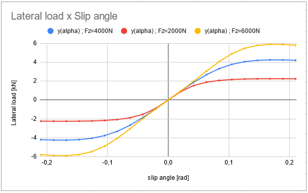 Where a1, a2, a3 and a4 refers to k, µ1, y'(0) and Fz, respectively. In addition, there is another coefficient named a0, which refers to the parameter C. With these equations it is possible to build the Magic Formula in function of x, which it refers to the slip angle and y refers to the lateral load.