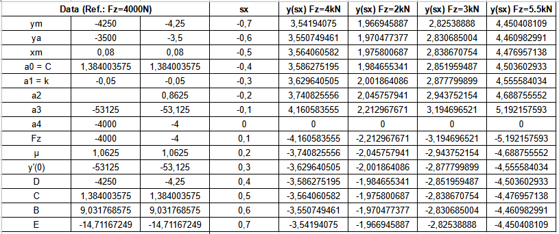 Figure 19 illustrates the calculations summarized in one table together with the calculatons of the Magic Formula. In addition, the same procedure applied for 4000 N reference vertical load was applied for 2000 N, 3000 N and 5500 N. The range of σx is applied accordingly of what was seen in the Figure 17.
