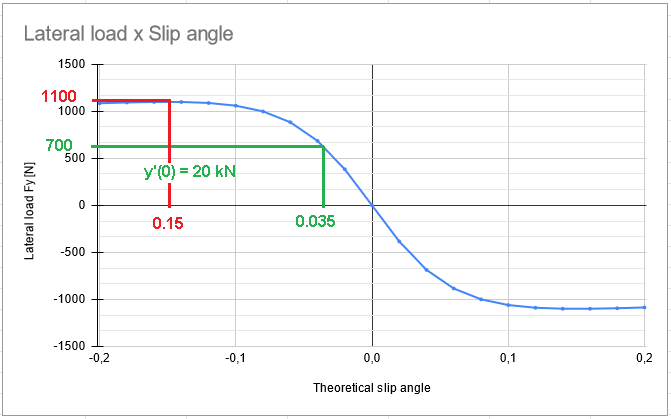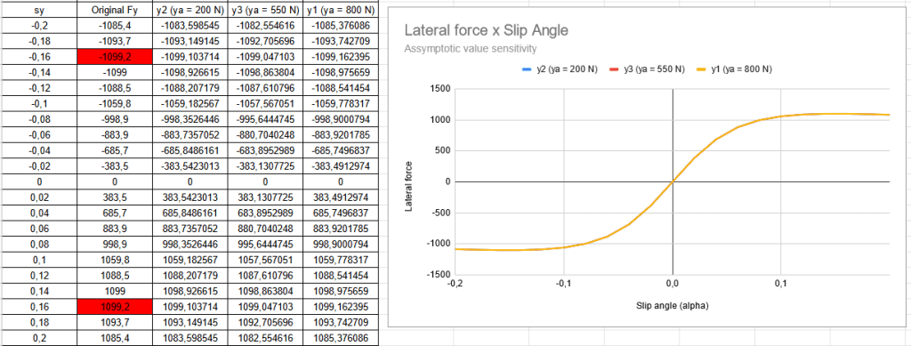 The next step is to guess the assymptotic value ya, which represents the lateral load produced at very high slip angles. This is a condition which the tire already reached the maximum performance, but the slip angles continues to increase. Usually, Fy decreses until reaches a almost constant force, which is dramatically lower than peak Fy. A good guess is 800 N and the following equations can be applied: