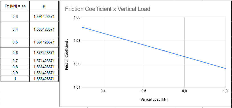 Where µ is the friction coefficient obtained by D equation in the beginning of the article, µ1 is the friction coefficient resultant due to Fz, k is a derivaritive coefficient, given by k = dµ/dFz. In the calculations performed in this article, k is equal to -0.05 kN-1. Hence, it is possible to calculate and plot the the impact of Fz in µ1.