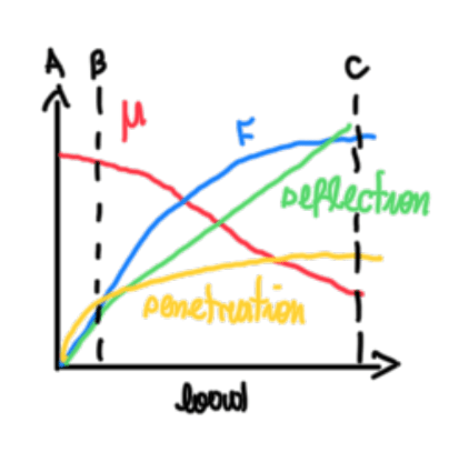 Figure 10 illustrates how μ, lateral F, tire deflection and penetration correlates which Fz. The main points at Figure 10 are penetration and deflection. The first exhibits a non-linear increase with Fz. This is the tire friction mechanism called indentation, which provides the biggest part of the grip. Deflection is the tread variation along the load increase. A linear increase can be observed, which suggests that at high lateral F the sidewalls exhibits a great distortion, and indirectly, more slip angles. However it is interesting to observe that as Fz increases, the friction coefficient reduces. This suggests that at some point the tire loses its elastic behavior when enter in the transitional zone. At this point the friction coefficient μ begins to reduce. The slip angle α became excessive and the tire finally reach the frictional zone, which the tire loses grip, thus lateral force F.