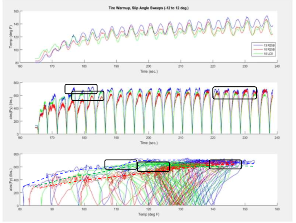 Figure 11 illustrates the screen of a data acquisition system about the tread temperature evolution during an outing. As can be seen, the blue line describes a tire that is faster to heat up and is able to operate at the same grip level. The green line describes a tire that heats up faster than the one represented by the blue line. However, it exhibited a decrease in the grip at the end of the test. The tire described by the red line builds grip and temperature more progressively, but generates the same grip as the tire of the blue line. Finally, it is possible to conclude, just visualizing the variation on the tread temperature that the blue line tire is more sensitive to heat variations, the other two are more gentle and bring grip more slowly.