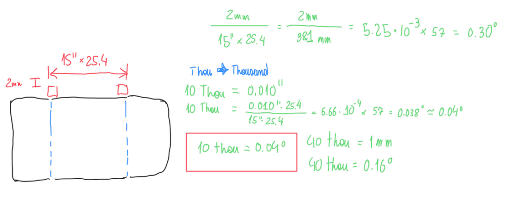 Figure 2 illustrates that 10 thou is 0.010” and the wheel analyzed has a rim of 15”. To measure the toe a spacer of 10 thou is placed on the wheel. The difference between them is converted to degrees which is the toe angle. Hence, 10 thou is converted to mm and divided by the rim diameter also in mm, the value obtained is an angle, but in radians, which must be converted to degrees. This can be done by multiplying the result by 57. Hence, 10 thou is equal to 0.04°. In addition, 10 thou is also equal 0.254 mm. Therefore 40 thou is equal to 1 mm. Figure 2 illustrates a spacer of 2 mm, which is adding 80 thou of toe, or including 0.30° of toe out. The main effect of the toe angle is the stabilization of the steering wheel. Under cornering maneuver the toe-out helps the turn-in movement and when braking it helps to bring back wheels to the straight forward position. Hence toe-out stabilize the car during braking. Conversely the toe-in motivates a fast returning of the steering, which occurs in an unstable condition. In some racing series toe is adjusted differently on each wheel depending of the track. For instance, in oval racing series, the toe adjustment is usually the following one: