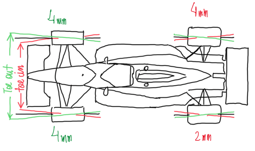 In Figure 3 the front wheels are 4 mm out while in the rear wheels have different values, 4 mm in and 2 mm out. The effects due to front wheels adjustment result in a proper turn-in, since in ovals the cars only turns to one side. In addition the steering is more stable to control. The toe-in adjusted in the right rear wheel acts to stablize the car at turn-in movement. In addition, it also provides grip at zero slip angles α. The toe-out in the left rear wheel has the same effect that in front, but for rear wheels it helps more in traction.
