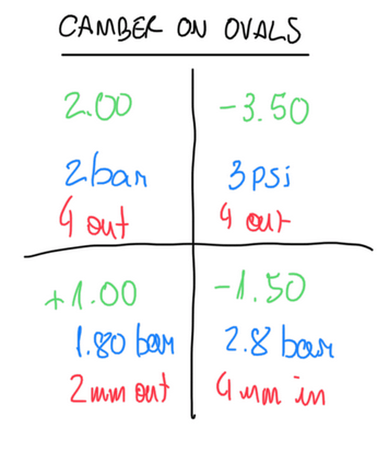 The camber angles are represented by the green numbers. In oval racing, cars only face left turns, thus the most requested tires are the one of the right side. These tire are set with negative camber angles due to camber gain effect. In the righ front wheel this effect is higher, so highest negative value observed. In right rear wheels, the value is lower, but still negative to keep the best contact patch for it during cornering, since this wheel is responsible for the car stability. The other two wheels are set with positive camber angles γ, because due to load transfer, they displace vertically. Hence, the camber gain effect occurs, but, to avoid extreme negative values, the camber is set positive and then a neutral value is obtained inside the corner. It is interesting to observe the other parameters for each wheel. The wheels of the outside (right, in ovals) are the most loaded ones, thus they have a higher pressure, 3 and 2.8 bar, front and rear, respectively. Another reason is the reduction of the contact patch length which favors the performance on the straight, reducing the rolling resistance and improving the maximum speed. For the left wheel the pressure is lower, since this considerably less loaded that the right ones. In addition, the lower pressure at front improve a bit the contact patch, which is good for corners. The camber setup for raining condition is different, higher negative values are used to reduce the contact patch and improve the tire temperature. Since the track is colder, tires lose temperature and due the water presence, they must be heated constantly. The excessive negative camber changes the contact pressure to the direction of the inner portion of the thread and reduce the contact patch length. This last point is good to avoid aquaplaning.